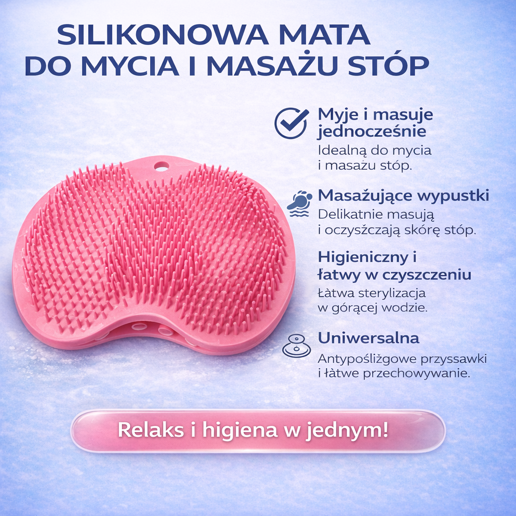 Silikonowa mata, która umożliwia dokładne mycie i masaż stóp pod prysznicem — bez wysiłku.